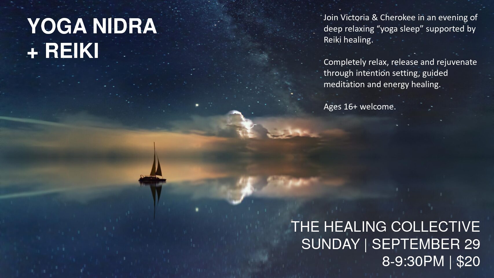 Join Victoria and Cherokee in an evening of deep relaxing "yoga sleep" supported by Reiki healing. Completely relax, release, and rejuvenate through intention setting, guided meditation and energy healing. Ages 16+ welcome. Contact Cherokee to register, $20 per person.